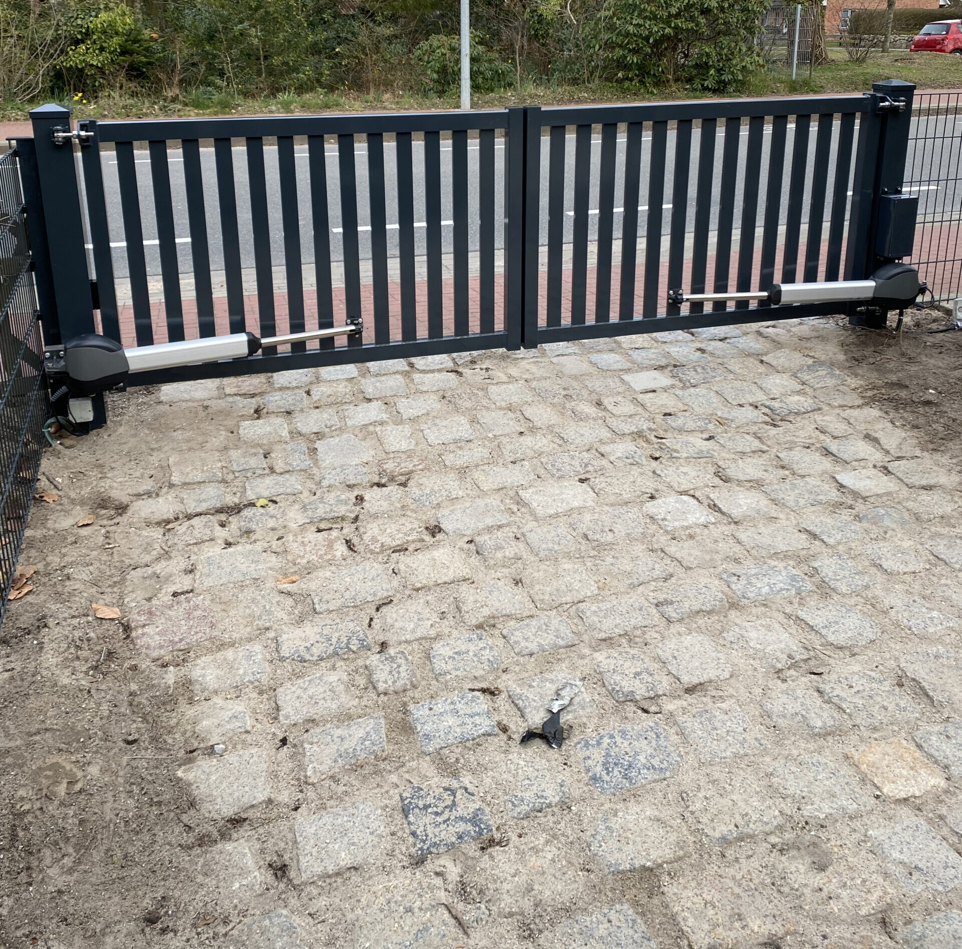 Antrieb ist fest mit dem Boden verankert. Die Pforte wird über ein Zahnrad, mit Hilfe einer Zahnstange, auf und zu bewegt.